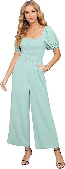 Jumpsuits for Women Dressy Short Sleeve Smocked High Waist Wide Leg Pants Loose Romper Outfits