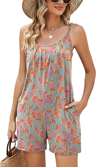 Womens Casual Summer Sleeveless Romper Loose Adjustable Spaghetti Strap Stretchy Shorts Jumpsuits with Pockets
