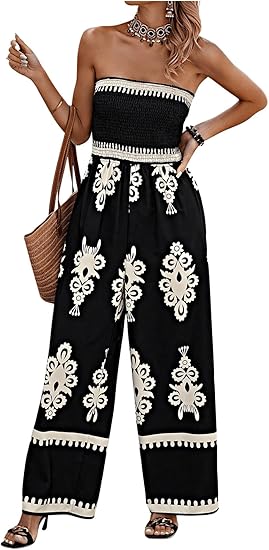 Women's Boho Floral Print Strapless Wide Leg Bandeau Tube Jumpsuit Sleeveless One Piece Playsuit