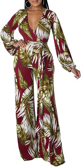 Women's Sexy V Neck One Piece Jumpsuits Long Sleeve Casual Wide Leg Long Pants Jumpsuits with Belt