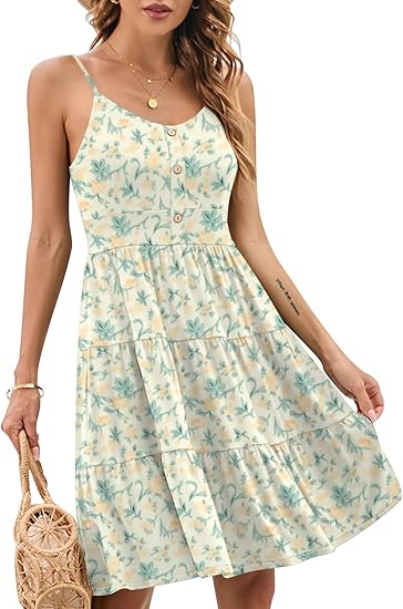 Sundresses for Women Casual Summer Beach Sleeveless Spaghetti Strap Dress Button Down Ruffle Flowy Pleated Dresses