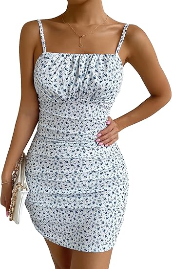 Women's Summer Ditsy Floral Ruched Mini Dress Sleeveless Cami Sundress