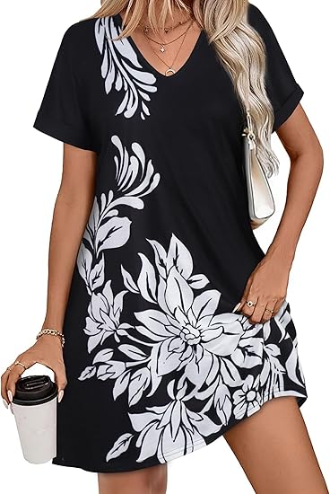Summer Dresses for Women V Neck Short Sleeve Flowy Tshirt Dress Casual Loose Sundress with Pockets