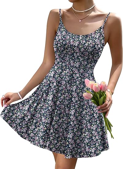 Women's Summer Dress Adjustable Spaghetti Strap Floral Mini Casual Dress with Pockets Fit & Flare Beach Sundress