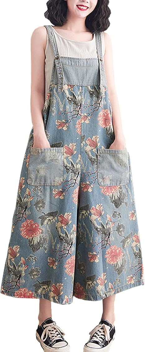 Women's Loose Adjustable Straps Print Baggy Denim Overalls Casual Bib Jeans Wide Leg Jumpsuit Rompers Pants