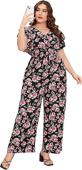 Women Plus Size Jumpsuit Wrap V Neck Ruffle Short Sleeves High Waist Wide Leg Romper Pants