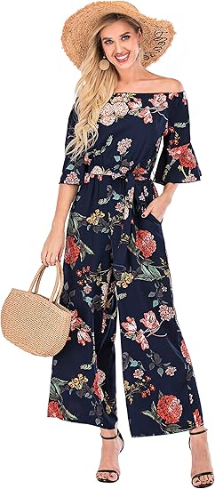 Jumpsuits for Women, Floral Off Shoulder Ruffled Short Sleeve High Waist Wide Leg Pants Romper Dressy
