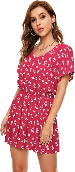 Floral Jumpsuits for Women, casual Loose Romper Short Sleeve Smocked High Waist Wide Leg Pants Outfits
