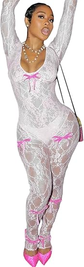 Women's Sheer Lace Long Sleeve Sexy See Through Bowknot Decor Bodycon Jumpsuit Unitard Bodysuit Date Night Outfits
