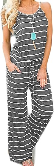 Women Casual Sleeveless Spaghetti Strap Striped Lounge Pajama Jumpsuit