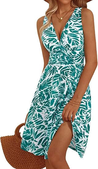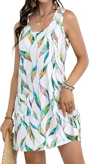 Women's Summer Dresses, Casual Sleeveless Boho Beach Dress, Scoop Neck T-Shirt Floral Sundress with Pocket