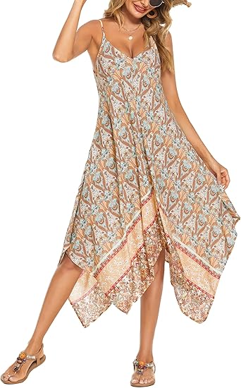 Women's 2024 Summer Dress Casual Boho Sundress Spaghetti Strap Swimwear Cover Up Beach Flowy Midi Vacation Dresses