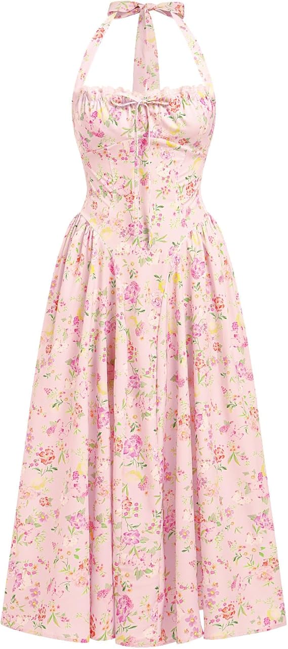 Floral Corset Dress Solid Long Dress Sleeveless Halter Low Cut Dress Open Back Bustier Midi Dress Summer