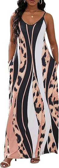 Women's Summer Casual Sleeveless V Neck Swing Dress Fit & Flare Flowy Tiered Maxi Beach Sundress with Pockets